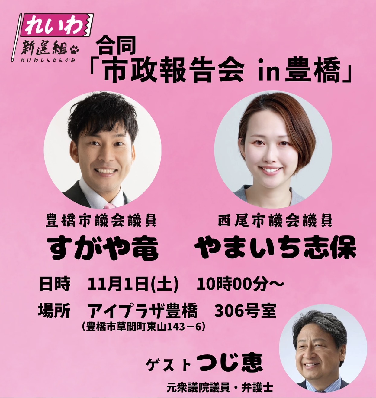 11/1(土)市政報告をすがや竜議員と合同で豊橋にてさせていただきます。